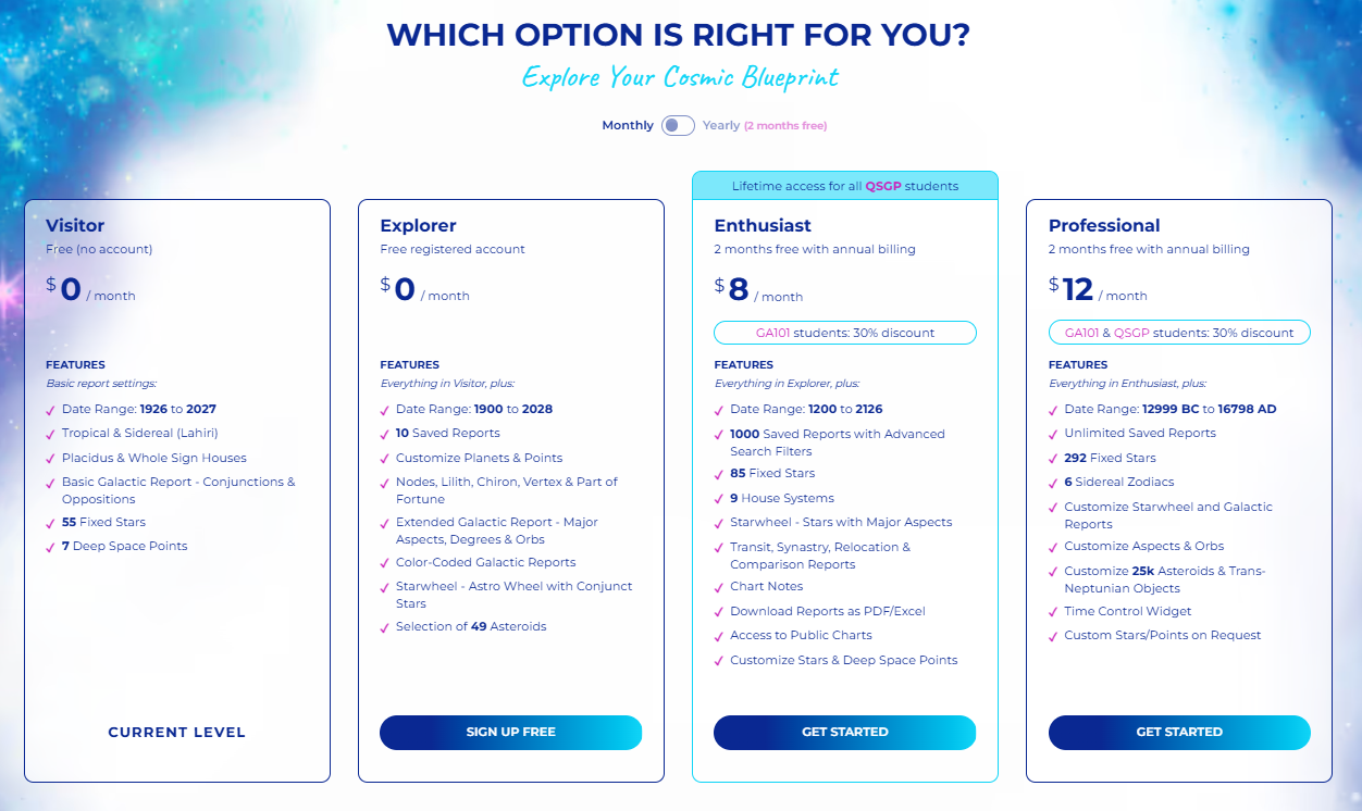 Over the years, through my own research and working with thousands of astro charts, I kept missing a space where I could easily review and organise many data points with multiple layers with ease, zoom into specific stars or deep space points, and follow threads of meaning without feeling limited by the structure of traditional astro tools. The PRO-level features and the new design were born from that desire. If you are a passionate astrologer exploring beyond the known, my hope is that you will enjoy using the GalacticAstroChart in support of your research going forward.
