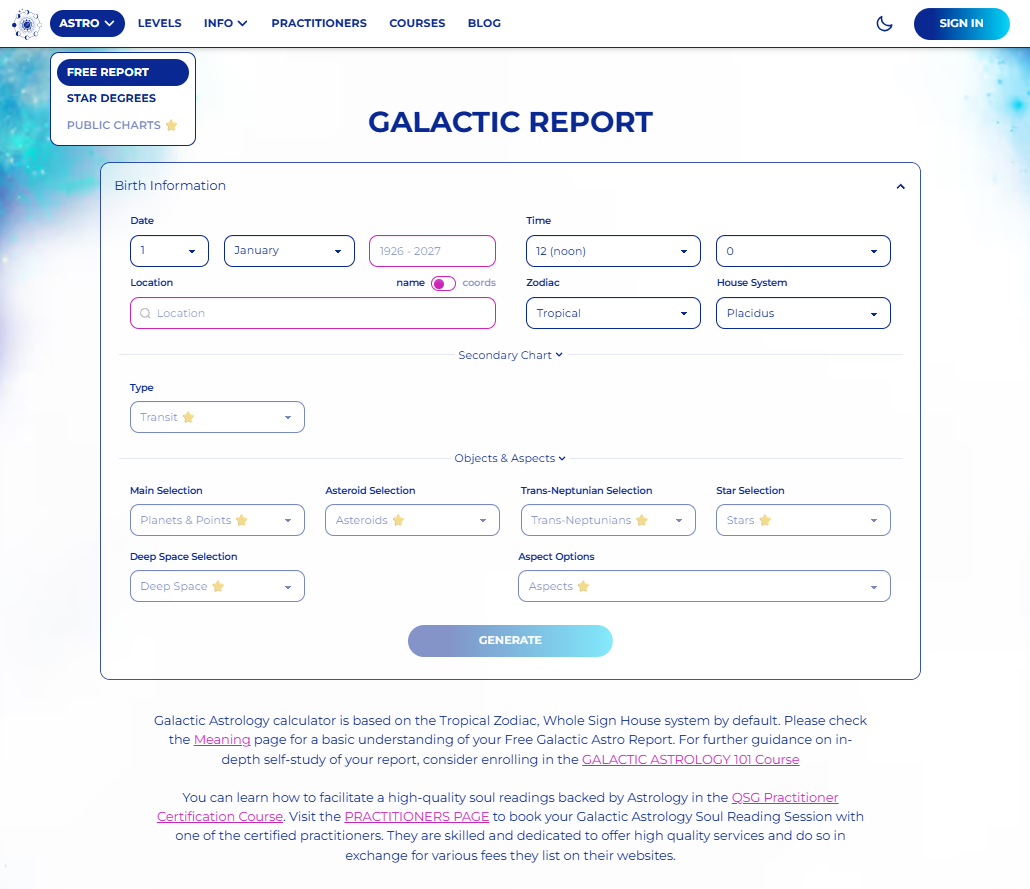 Visit the GalacticAstroChart.com and navigate to the Galactic Report